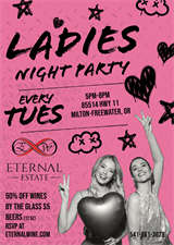 Every Tuesday we host ladies night 5-8pm at Eternal. We offer 50% glass pours of our Eternal Wine label and 1$ off beers!
